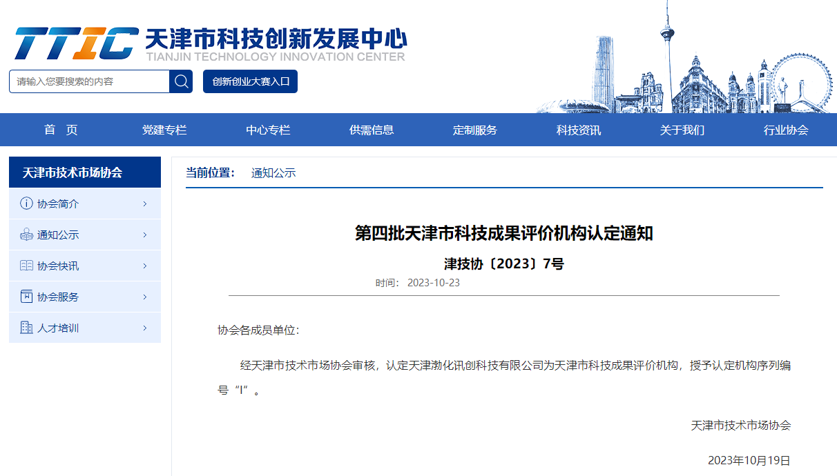 2023年10月23日,天津市技術(shù)市場協(xié)會發(fā)布通知,認(rèn)定天津渤化訊創(chuàng)科技有限公司為天津市科技成果評價(jià)機(jī)構(gòu)。