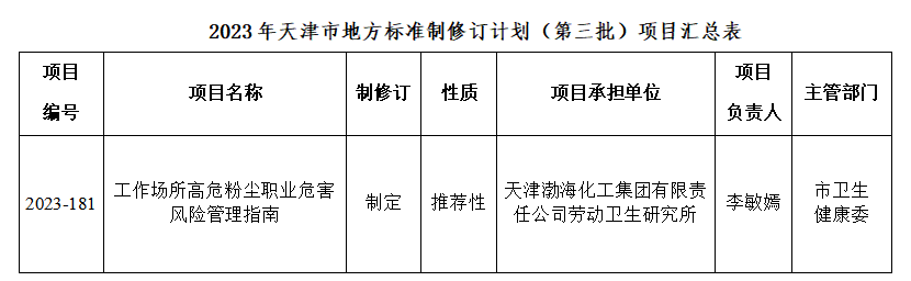 近日,2023年天津市地方標(biāo)準(zhǔn)制修訂計(jì)劃(第三批)發(fā)布,天津渤?;ぜ瘓F(tuán)有限責(zé)任公司勞動(dòng)衛(wèi)生研究所承擔(dān)的《工作場(chǎng)所高危粉塵職業(yè)危害風(fēng)險(xiǎn)管理指南》獲批天津市立項(xiàng)。
