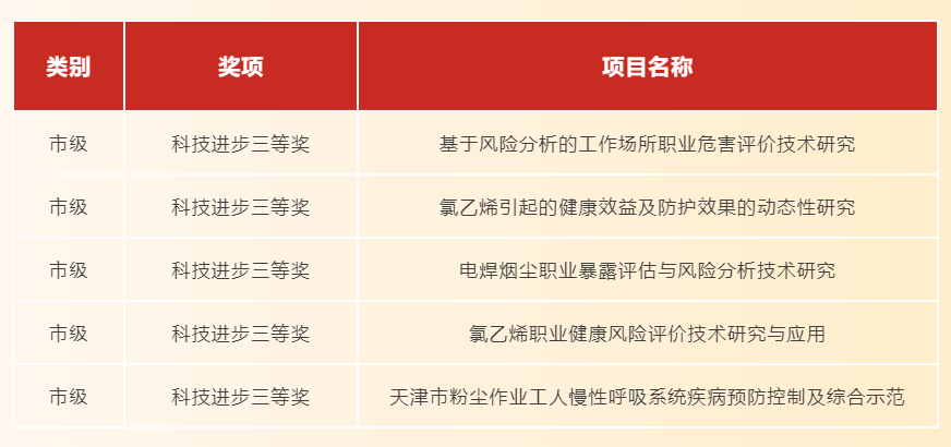 近年來(lái),天津渤?;ぜ瘓F(tuán)有限責(zé)任公司勞動(dòng)衛(wèi)生研究所圍繞職業(yè)衛(wèi)生領(lǐng)域的科研工作碩果累累,先后獲得5次天津市科技進(jìn)步獎(jiǎng)。