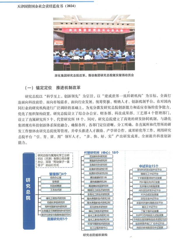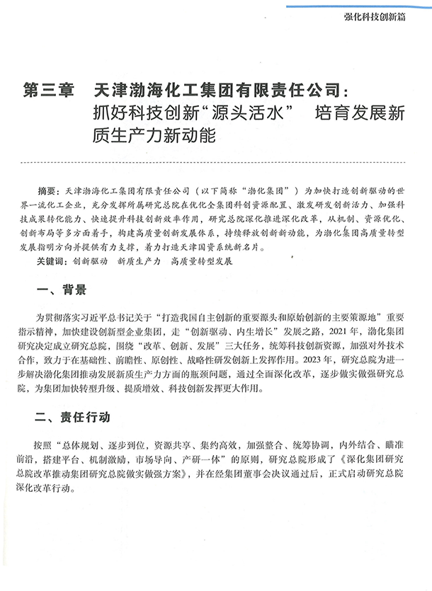 會上,《天津國資國企社會責(zé)任藍(lán)皮書(2024)》正式發(fā)布,展示了天津市國資國企履行社會責(zé)任新的豐碩成果。其中,《抓好科技創(chuàng)新“源頭活水” 培育發(fā)展新質(zhì)生產(chǎn)力新動(dòng)能》渤化集團(tuán)研究總院深化改革“再出發(fā)”案例成功入選藍(lán)皮書“強(qiáng)化科技創(chuàng)新篇”。