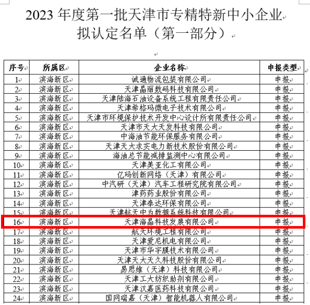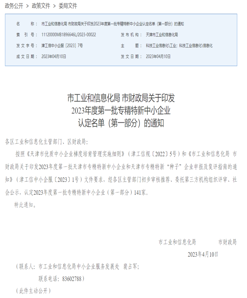 近日,市工業(yè)和信息化局、市財(cái)政局發(fā)布《市工業(yè)和信息化局 市財(cái)政局關(guān)于印發(fā)2023年度第一批專精特新中小企業(yè)認(rèn)定名單(第一部分)的通知》,集團(tuán)公司所屬海晶科技、合材所2家單位被認(rèn)定為2023年度第一批天津市專精特新中小企業(yè)。